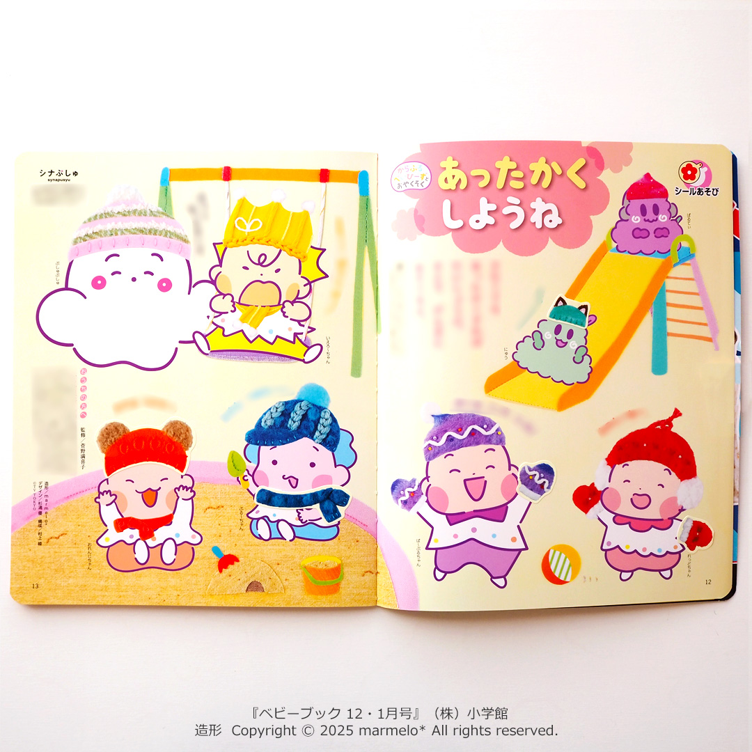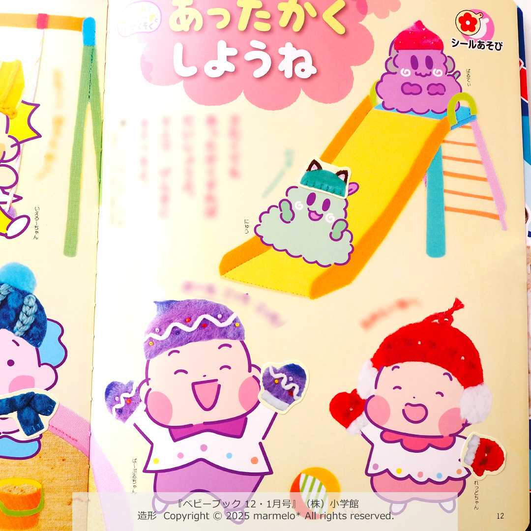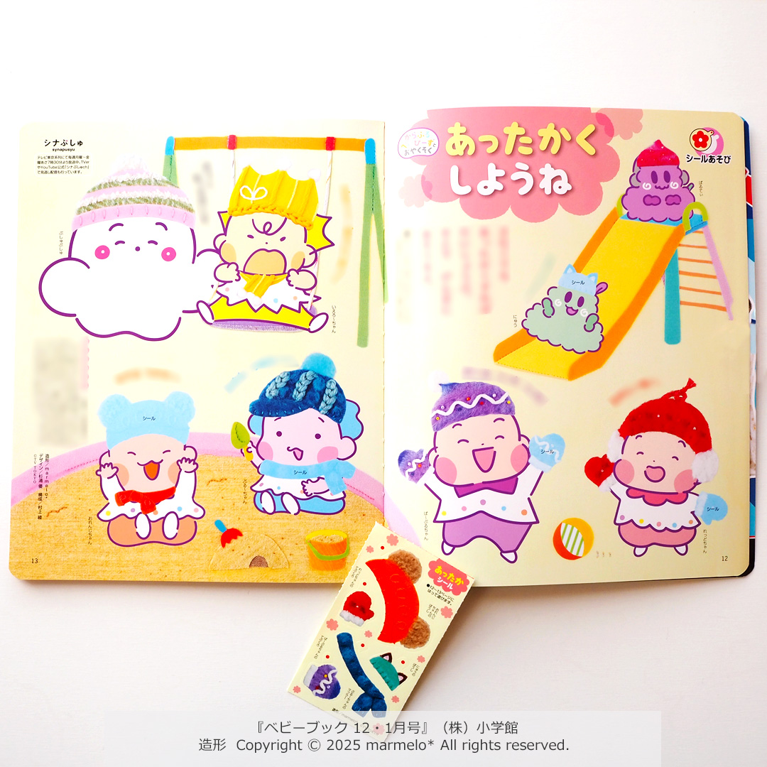 (株)小学館様より2025年10月31日発売『ベビーブック 12・1月号』12・13頁シールページ「あったかくしようね」造形(背景・小物)を担当しました。